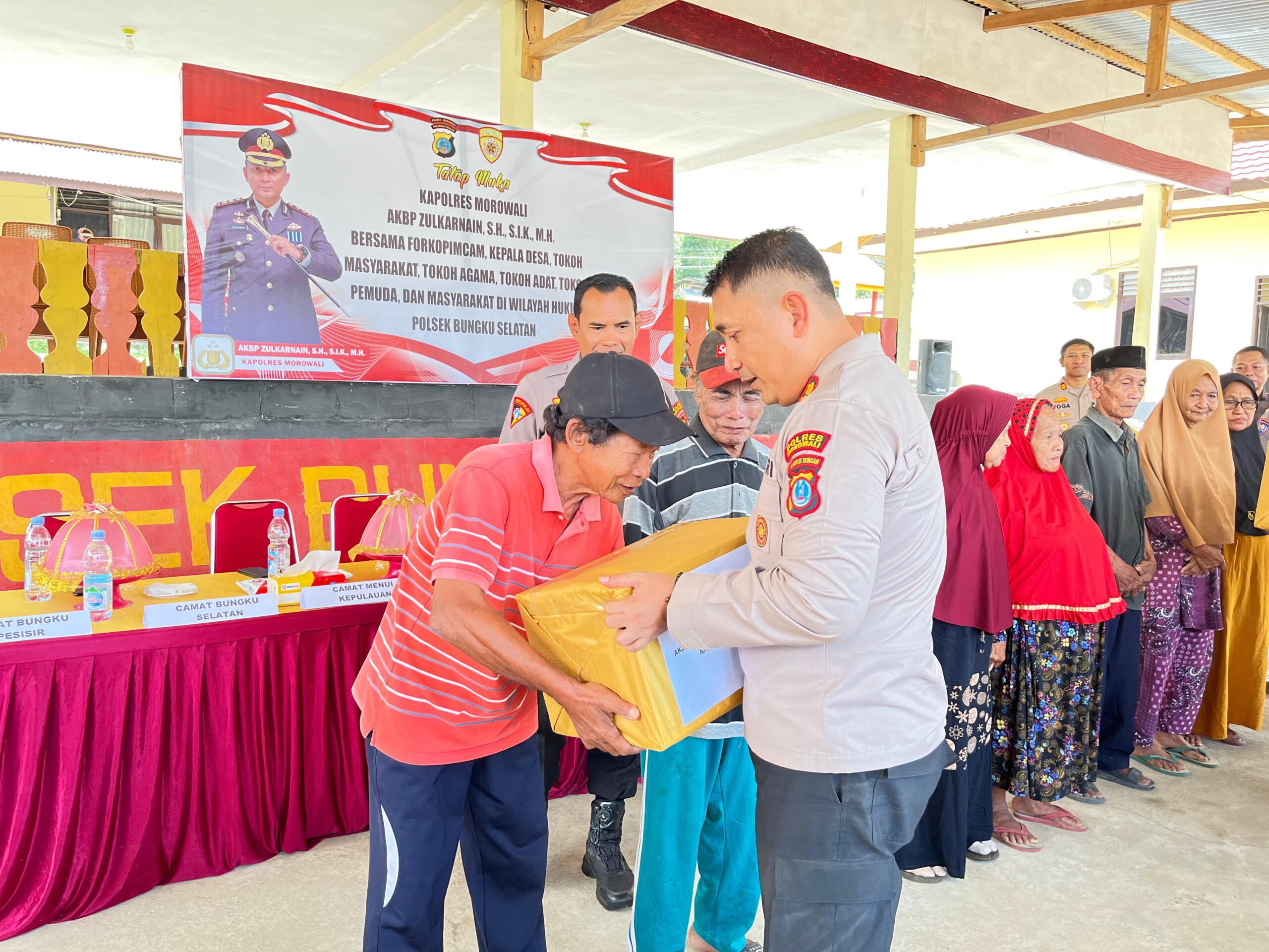 Acara yang berlangsung di halaman Kantor Polsek Bungku Selatan itu turut dihadiri oleh Danyon C Pelopor sat Brimob Polda Sulteng, PJU Polres Morowali, Kapolsek Bungku Selatan Akp I Ketut Yoga Widata, Danramil 1311 Letda A. Sitohang, Sekcam Bungku pesisir Samran S.H Mewakili Camat, Camat Sombori Kepulauan Suaib Amja, Camat Menui Kepulauan Jawir S.E., M.M., perwakilan perusahaan, kepala desa, BPD, tenaga kesehatan, dan sekitar 70 orang masyarakat.