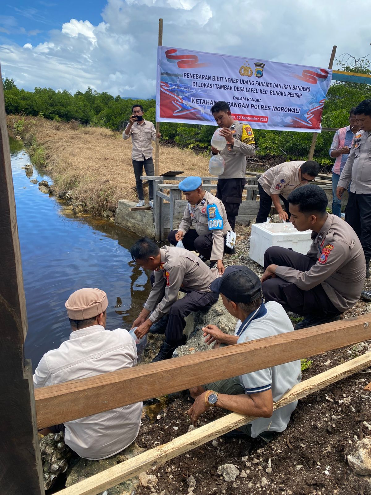 Morowali, Hariannet.co.id- Kapolres Morowali yang diwakili oleh Kabag SDM Polres Morowali, AKP Mukhlis, memimpin kegiatan penebaran bibit nener udang vaname dan ikan bandeng di tambak binaan masyarakat Desa Lafeu, Kecamatan Bungku Pesisir, Rabu (10/9).