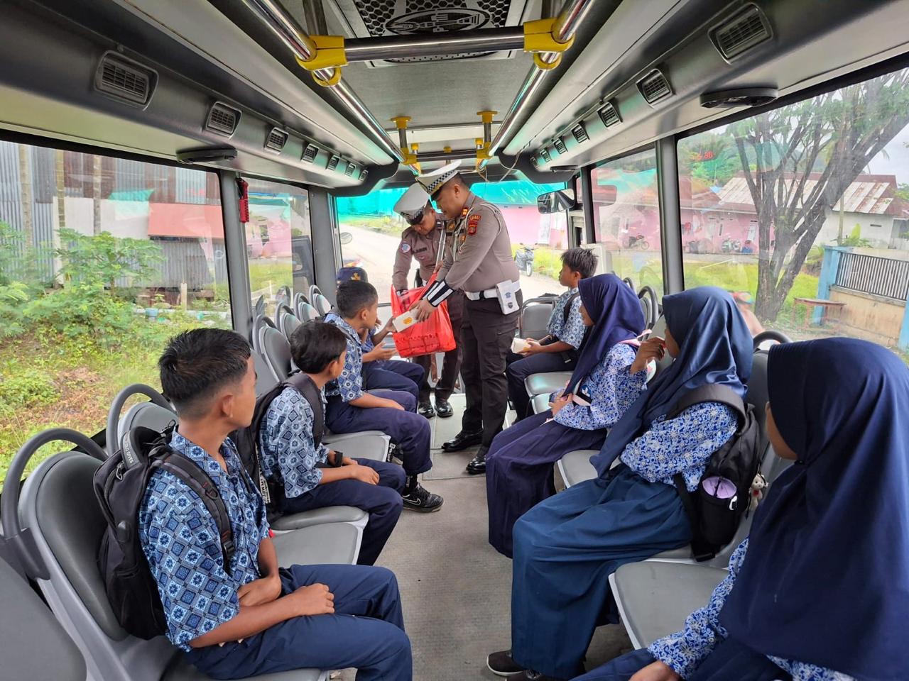 Dalam kesempatan tersebut, personel lalu lintas menyampaikan pesan-pesan keselamatan berlalu lintas (Kamseltibcarlantas) baik kepada sopir maupun siswa-siswi yang menjadi penumpang. Sebagai bentuk kedekatan dengan masyarakat, kegiatan ini juga dirangkaikan dengan pembagian snack sarapan pagi kepada sopir bus dan para pelajar.